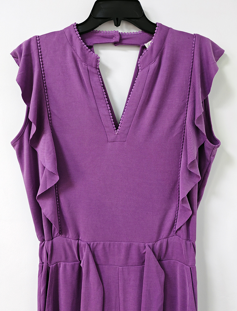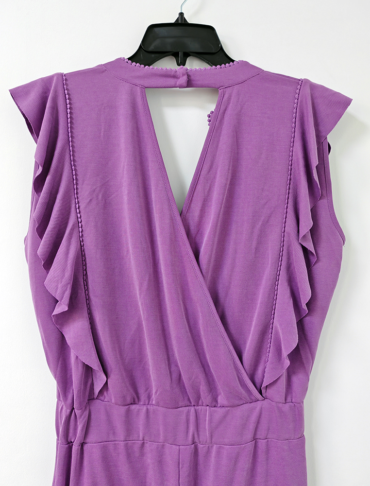 Description: This fashion jumpsuit is made of high quality modal pique sand washed, it has very nice handfeel.  We have made this jumpsuit with dotty tape along the neckline and 2 sides of upper body. And we have made volant sleeves from shoulder to waist. Also we made overlap panel at back and snap button at cb neck. Thus we get a very nice looking and stylish modal fashion jumpsuit for you.