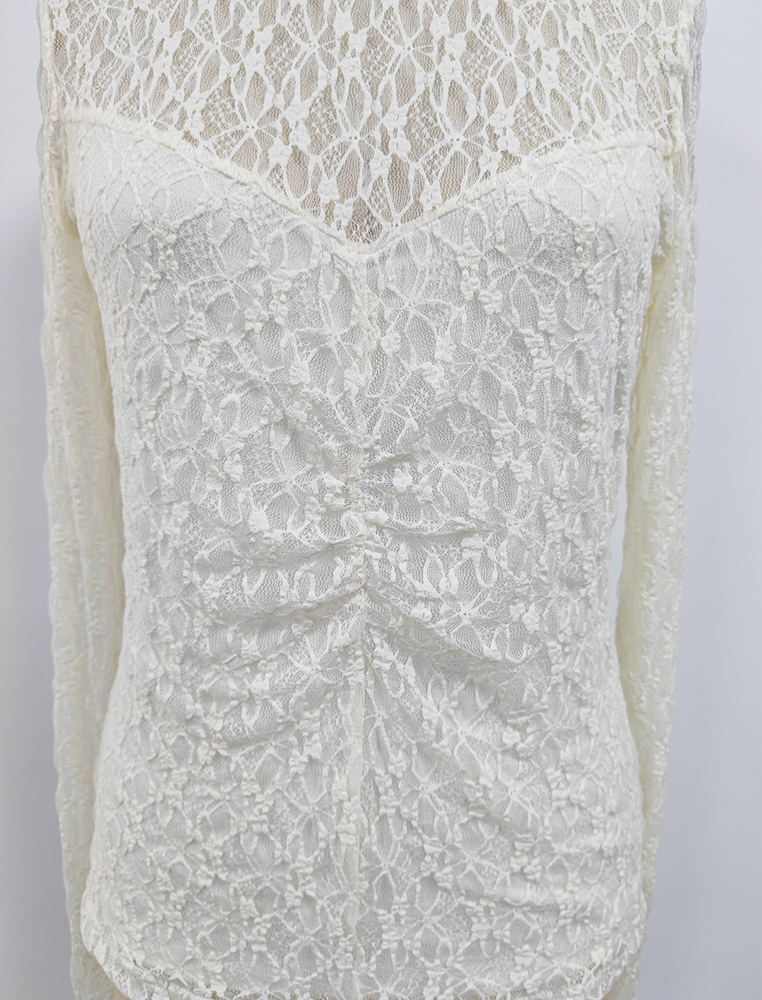 Description: This fashion top is made of nice lace with elastic, we have made this top with stand up collar and gathering at center front of body with elastic. And also we have added viscose jersey lining at front panel. It is a very nice looking and stylish lace top for you.