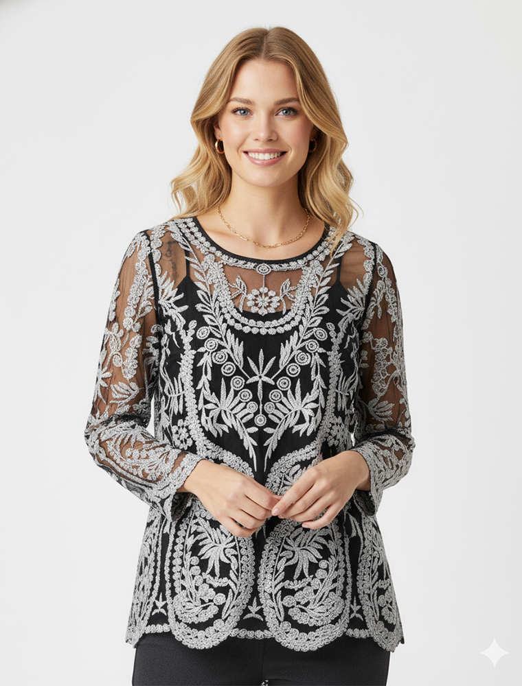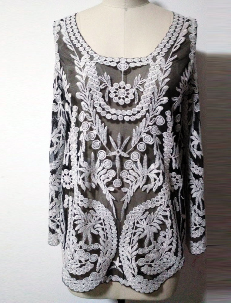 Description: This fashion blouse is made of mesh embroidered allover, it is quite delicate and nice looking.