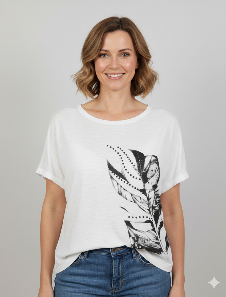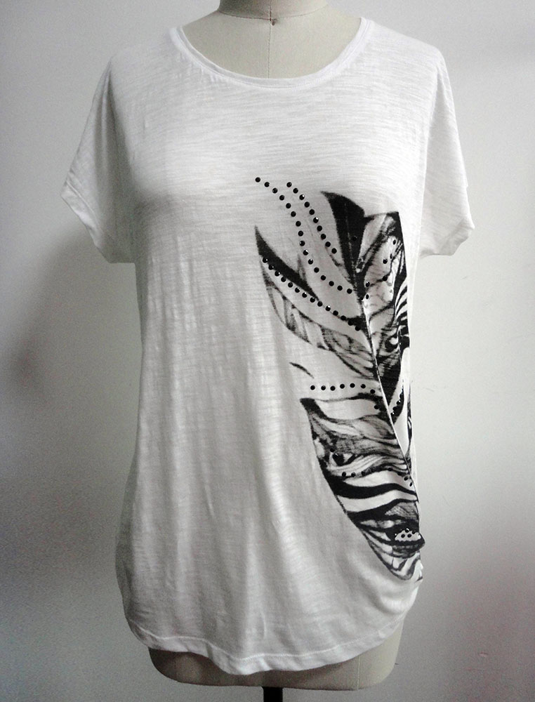 Description: This fashion blouse /T-shirt is made of high quality cotton jersey, with leave print and hot fix stones at front left side, and we also make pleats on side seam at bottom, it is a very nice looking blouse /t-shirt for your wardrobe.