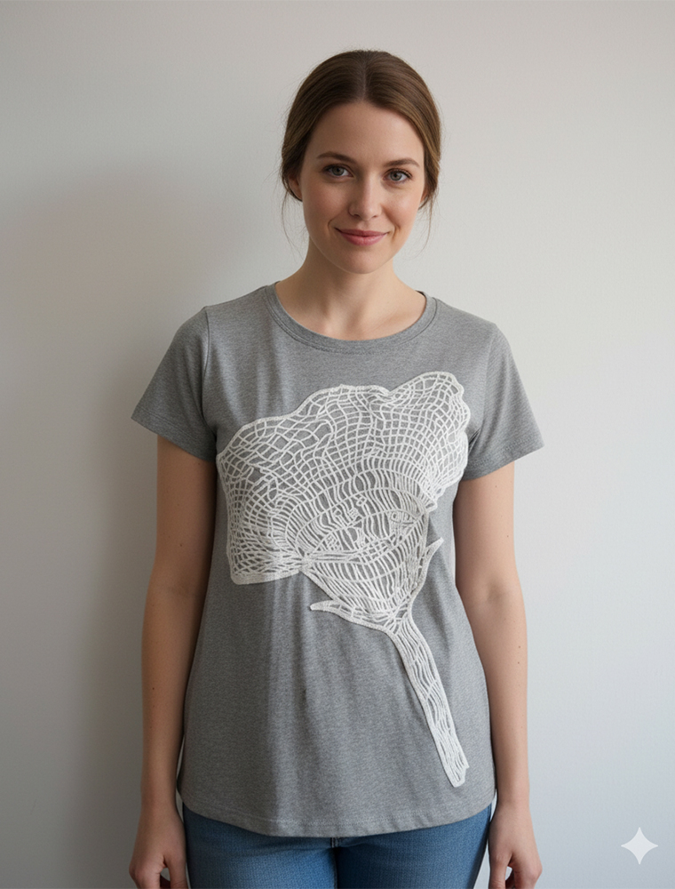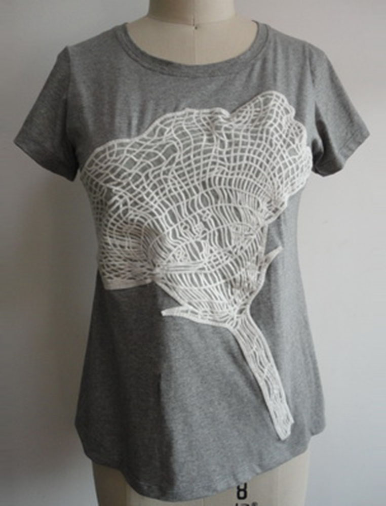 Description: This fashion blouse /T-shirt is made of cotton elsatane melange jersey with big pattern embroidery at center front, it is a very nice looking and cute style for you.  Your must-have blouse / t-shirt for your wardrobe.