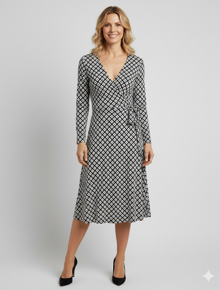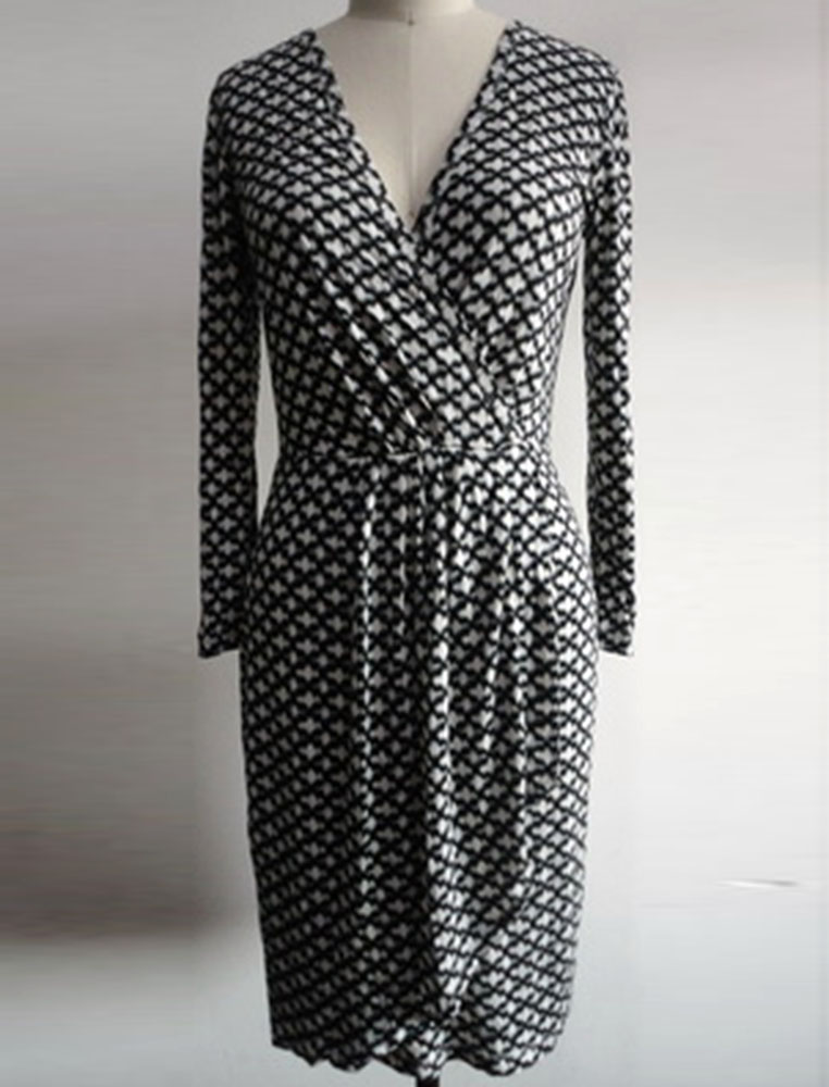 Description: This fashion dress is made of viscose jersey printed allover, and with overlap at front body and skirt, we have a very popular and fashion dress for lady.