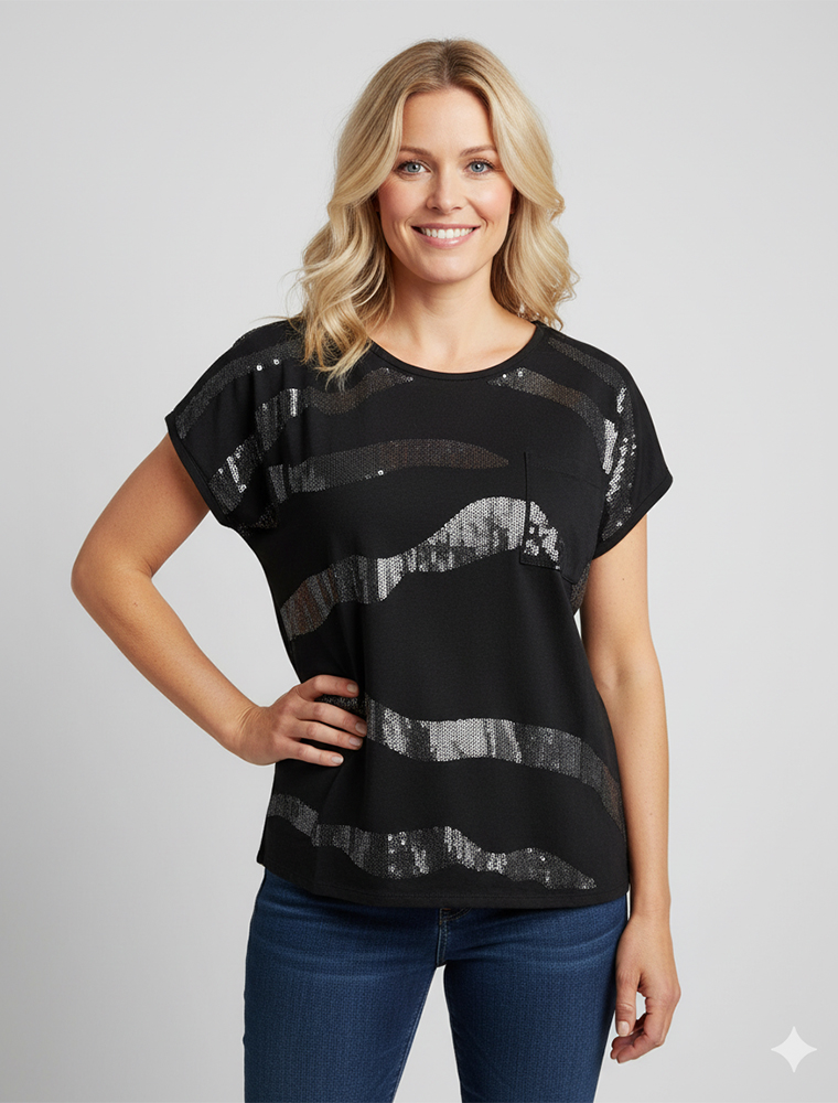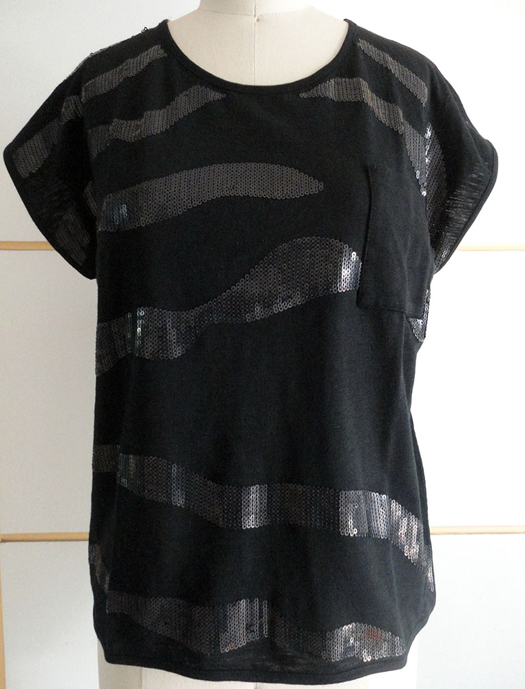 Description: This fahsion blouse is made of high quality cotton jersey, with sequins embrodiery at front, the style is very fashionable and comfortable to wear.