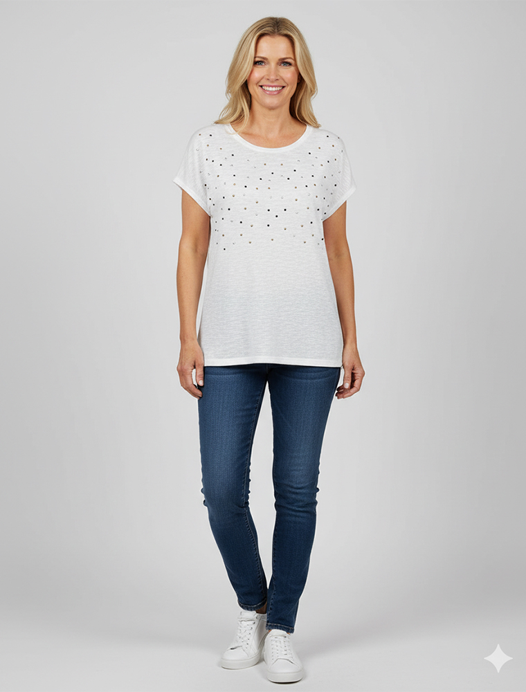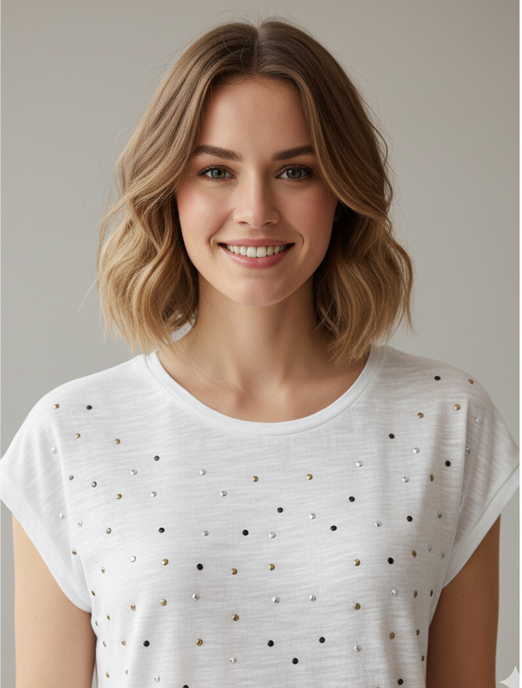 Description: This fashion blouse is made of structured jersey, and with hot fix stones at front, it is very comfortable to wear and nice looking.