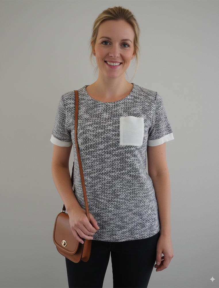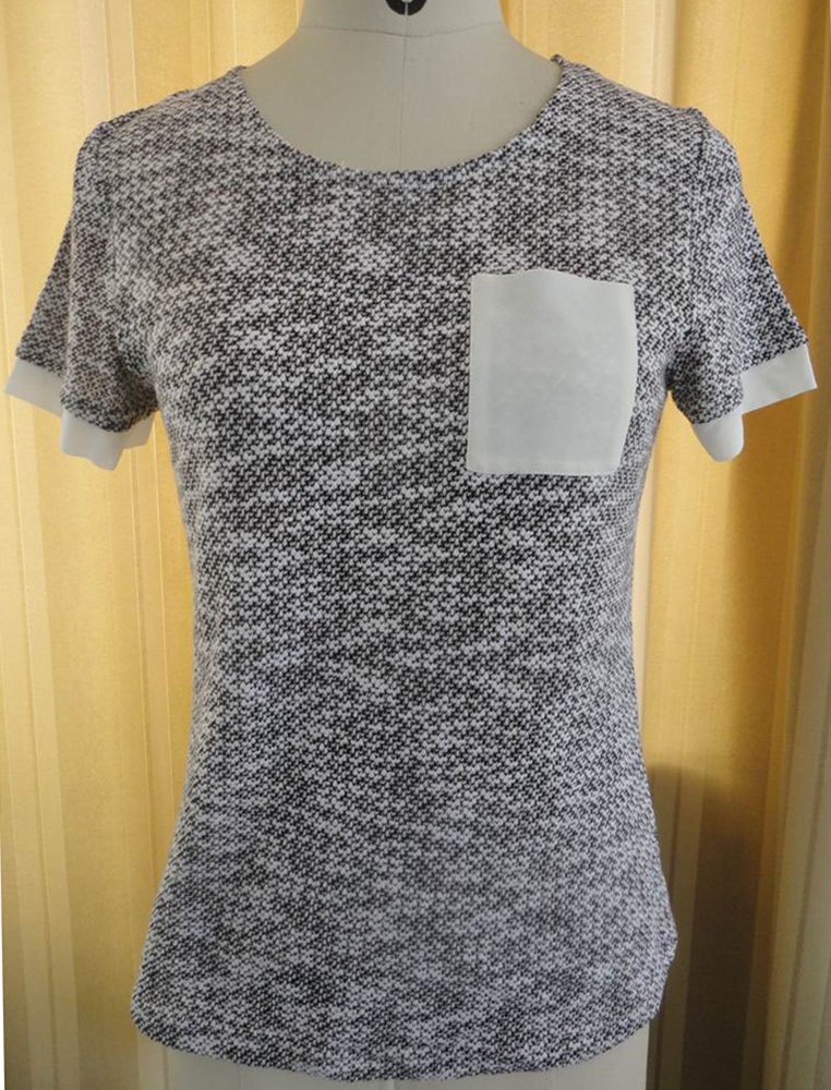 Description: This fashion blouse/ T-shirt is made of knitted structured fabric, with chffion pocket at chest front and sleeve end, it is quite comfortable and nice looking fashion blouse for you.