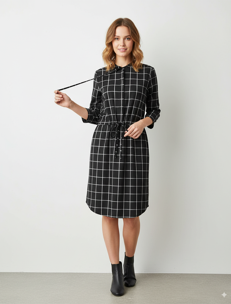 Description: This fashion dress is made of cotton check fabric, with gathering and self fabric tape at waist, quite popular and nice looking style for lady.