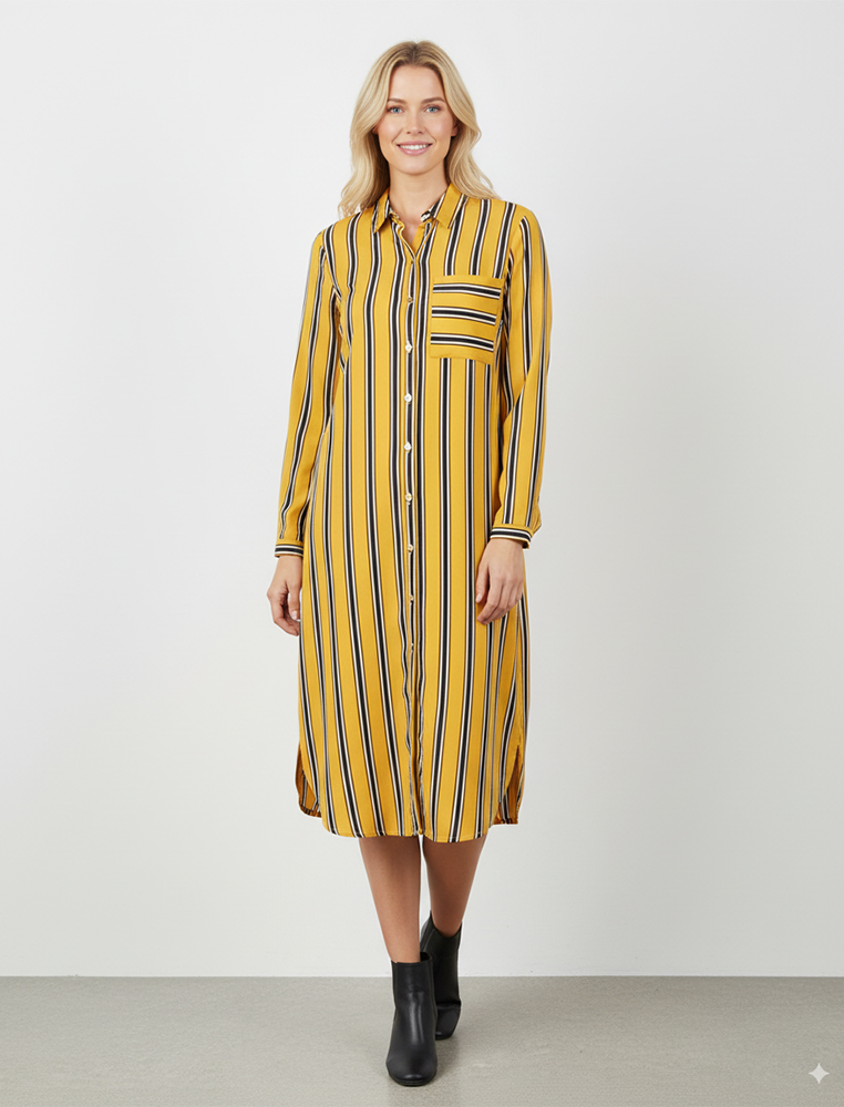 Description: This fashion dress is made viscose plain woven with stripe printed, it is quite popular and fashionable.